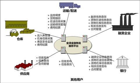 金澤物流集團為了改善中小企業在貸款融資過程中申請周期長、審批流程不透明、監管信息通知不及時等問題,特建設金融物流服務平臺。 平臺結合金融機構、商貿制造企業、監管企業、保險評估機構等多方企業,打造出一個集“融資服務、物流服務、監管服務、信息服務”為一體的一站式綜合性服務平臺。 處于供應鏈中的商貿制造企業,在平臺中以原材料或產成品做為質物,通過第三方物流公司的監管,將有形的產品或物料質押給金融機構以獲取融資。 金融機構在線下審核企業融資資質后,通過平臺在線審批融資申請、實時查看押品庫存、動態調整押品價格、短信獲知監管信息。 監管企業通過平臺管理押品庫存明細,查看押品倉庫實時監控,跟蹤押品價格走勢。 金融物流服務平臺創造了一個跨行業、相互交叉發展的新業務空間,解決了中小經銷商的周轉資金問題;提高了金融機構資金利用率;拓展了物流企業的新市場。