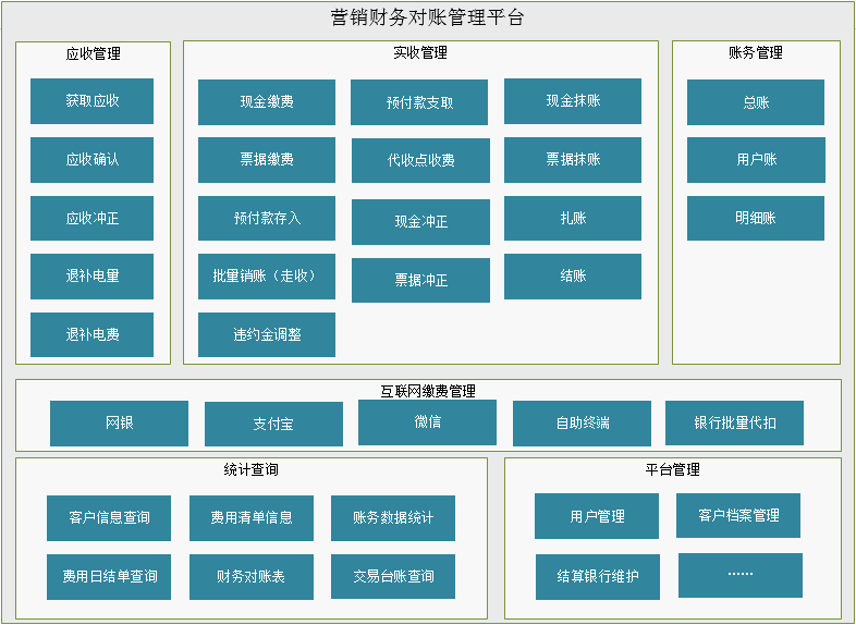 營銷財務對賬管理平臺為企業繳費結賬、與財務實現自動化對賬提供了統一標準、服務與接口,滿足傳統實體營業廳、自助服務終端、銀行代扣到微信、支付寶互聯網等繳費方式統一接入平臺,支撐企業財務統一對賬管理,推動企業為客戶提供快速、高效、便捷服務,提升企業賬務管理水平。