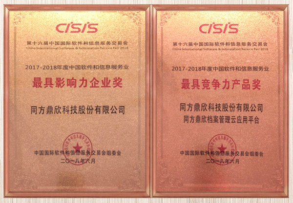 6月12日,第十六屆中國國際軟件和信息服務交易會(簡稱:軟交會)在大連盛大開幕。當晚,“2017-2018中國國際軟件和信息服務業年度發布會”在大連世界博覽廣場舉行。 會上,組委會先后宣布了2017-2018中國軟件和信息服務業的人物、企業、產品、服務平臺等多個獎項。在本屆大會上,同方鼎欣榮獲“2017-2018中國軟件信息服務業-最具影響力企業獎”,憑借在檔案管理云應用平臺業界的良好口碑和眾多落地案例榮獲“2017-2018中國軟件信息服務業-最具競爭力產品獎”,此次獲得兩項大獎是業界對同方鼎欣多年以來技術實力和優質服務的認可。