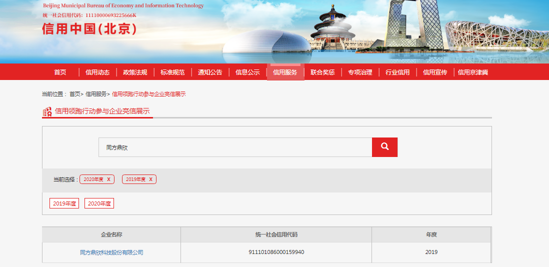 依據上述參與條件,同方鼎欣順利進入“信用領跑企業”入圍庫,并在主辦單位對公司的創新性、發展性、影響力以及信用行為和信用能力等方面進行綜合評價后,被擇優選入領跑企業名單,意味著在過去兩年中,同方鼎欣做到了信用“0瑕疵”,發展有創新。同時,作為信用領跑行動入選企業,同方鼎欣在“信用中國(北京)”官方網站主動“亮信”,展示企業信用狀況。