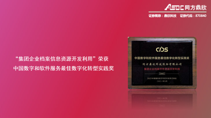 在此次評選中,同方鼎欣同時憑借在集團企業檔案信息資源開發利用領域的突出表現,榮膺“中國數字和軟件服務最佳數字化轉型實踐獎”。作為在檔案領域已深耕多年的IT企業,此次獲獎也是對同方鼎欣在助力企事業單位實現檔案數字化轉型方面所做出貢獻的肯定與認可。