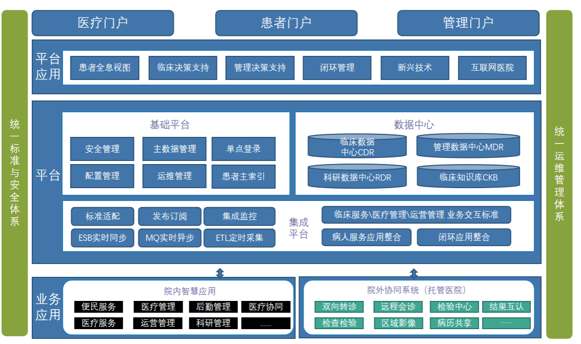 基于云計算、人工智能、大數據分析的智慧醫療云平臺,以醫患為中心、以電子病歷為核心、以醫囑費用為主線,實現五化(信息一體化、業務??苹?、管理精細化、操作智能化、運行無紙化),實現2個平臺+5個數據中心+n個應用。 本方案可協助醫療機構完成醫院信息互聯互通標準化成熟度測評等級四級甲等,五級甲等。電子病歷評級(2018版本)6級或以上。