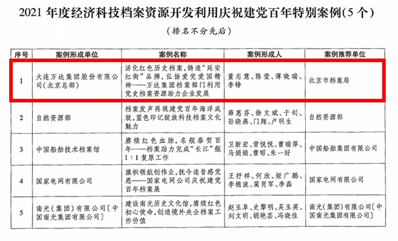 近日,國家檔案局發布了2021年度全國經濟科技檔案資源開發利用案例評選結果,由同方鼎欣協助大連萬達集團股份有限公司(北京總部)打造、申報的《活化紅色歷史檔案,鑄造“延安紅街”品牌,弘揚愛黨愛國精神——萬達集團檔案部門利用黨史檔案資源助力企業發展》從全國眾多申報案例中脫穎而出,經過初審和專家組綜合評議,作為唯一一家非公有制企業與其他四家國有企業案例一起入選五大慶祝建黨百年特別案例!這是對萬達集團在該案例中充分發揮留史存證、傳承文化重要作用的高度認可,也是對同方鼎欣在萬達集團檔案管理系統數字化改革中工作成果的積極肯定!
