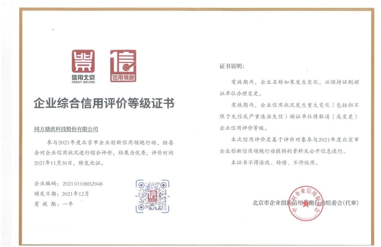 12月28日,2021信用北京暨(第七屆)信用中關村高峰論壇(簡稱信用論壇)在京召開,會上發布了2021年度北京市企業創新信用領跑企業及信用領跑園區名單,同方鼎欣作為信用企業代表全程參與本次盛會并再次榮登榜單,這標志著同方鼎欣在企業信用品牌建設上再次獲得正式認可,積累提升了公司信用資產、打造鼎欣信用品牌。