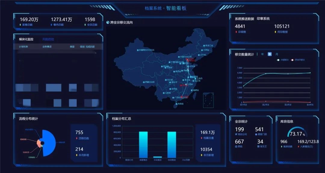 集團的“檔案管理智能看板”是對全集團檔案數(shù)據(jù)的高度集成,不僅能實時統(tǒng)計全集團檔案總量、借閱總量、移交總量、庫房總量及其分布情況,監(jiān)督其他業(yè)務(wù)系統(tǒng)推送檔案數(shù)據(jù)情況,還可以有效防控檔案數(shù)據(jù)安全,對“拖延歸檔、超期借閱、異常下載、蓄意刪除”等行為進(jìn)行監(jiān)控。