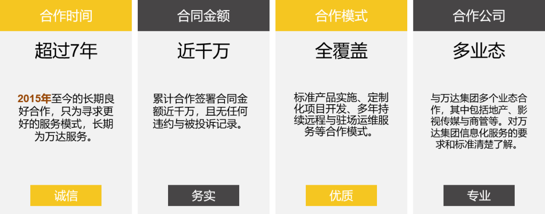 作為萬達(dá)集團資深信息化供應(yīng)商,同方鼎欣團隊自2015年起服務(wù)至今,歷時已超過7年,已合作完成了十余項系統(tǒng)的開發(fā)、運維服務(wù),達(dá)成了近千萬金額的合作,為萬達(dá)集團實現(xiàn)了多業(yè)態(tài)、全覆蓋的信息管理建設(shè),實現(xiàn)了信息管理由傳統(tǒng)到現(xiàn)代、由封閉式到開放式的重要轉(zhuǎn)變,為萬達(dá)集團信息管理向數(shù)字化、智慧化管理轉(zhuǎn)型升級提供了重要的助力。
