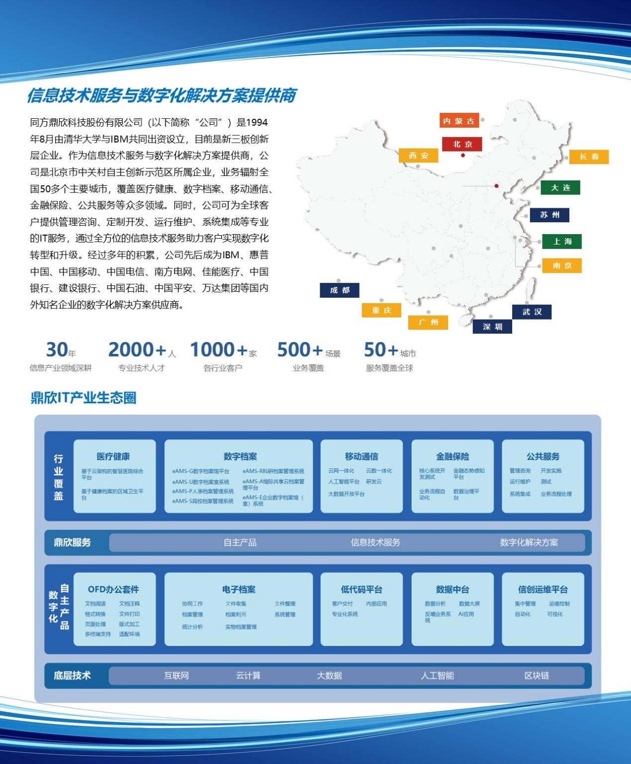 作為中國數(shù)字化歷程的同路人,成立于1994年的同方鼎欣是我國推進行業(yè)數(shù)字化轉型的先行者之一,致力于成為中國領先的信息技術服務與數(shù)字化解決方案提供商。30年來,公司秉承“科技創(chuàng)新、服務社會”的宗旨始終深耕信息產業(yè)領域。三十年來,公司業(yè)務發(fā)展迅猛,至今已覆蓋全國50多個主要城市,并在日本東京設有全資子公司?,F(xiàn)已成為覆蓋醫(yī)療健康、數(shù)字檔案、移動通信、金融保險、公共服務等眾多領域的解決方案服務商。同時,公司可為全球客戶提供管理咨詢、定制開發(fā)、運行維護、系統(tǒng)集成等專業(yè)的IT服務,通過全方位的信息技術服務助力客戶實現(xiàn)數(shù)字化轉型和升級。經過多年的積累,公司先后成為IBM、惠普中國、中國移動、中國電信、南方電網(wǎng)、佳能醫(yī)療、中國銀行、建設銀行、中國石油、中國平安、萬達集團等國內外知名企業(yè)的數(shù)字化解決方案供應商。