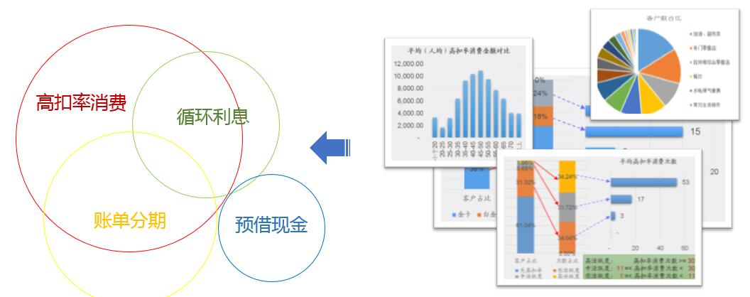 針對高扣率消費、循環利息、賬單分期與預借現金四大類客戶行為進行基本業務業務行為客群細分,詳細描述每一客群的特征表現,進行客戶畫像。